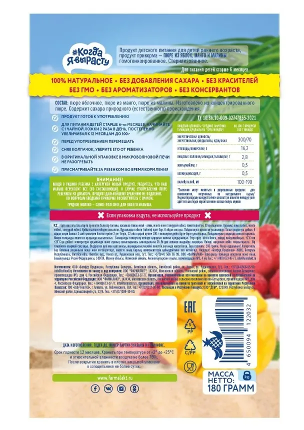 —Дет пит Когда я вырасту Пюре яблоко-манго-малина б/сахара с 6мес 180г м/у; 6