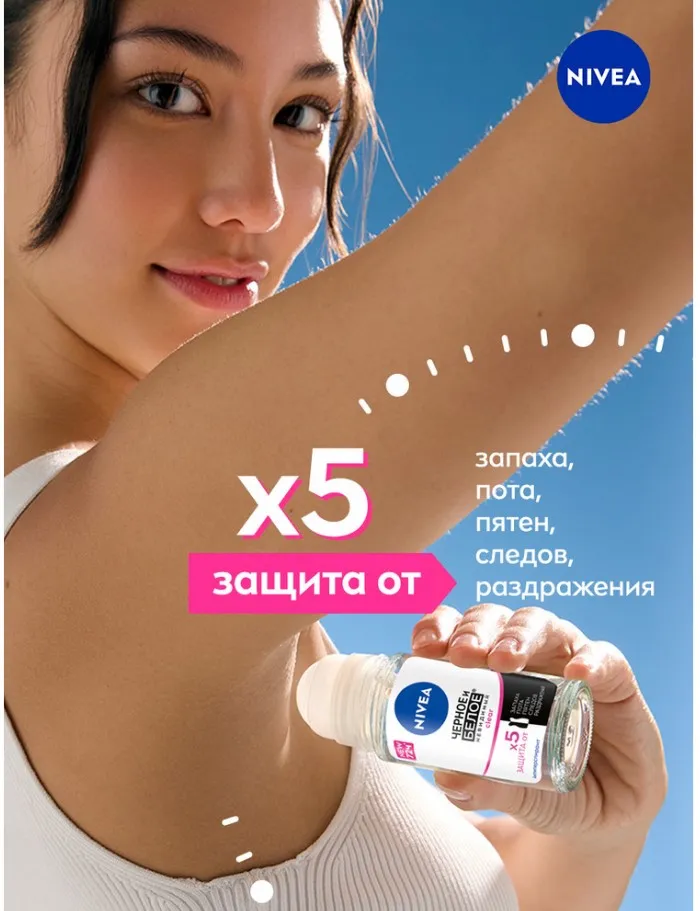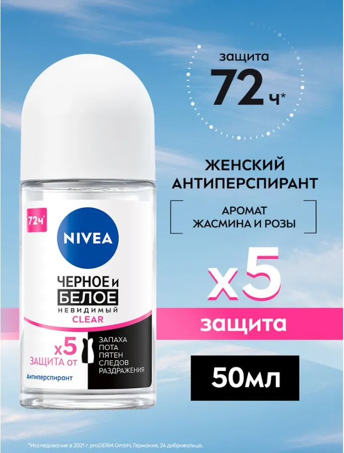 Дезодорант-антиперспирант спрей NIVEA Черное и Белое Невидимый Clear' с цветочным ароматом не оставляет белых следов на черной одежде и предотвращает появление желтых пятен на белой одежде. Черная одежда остается черной, а белая одежда дольше остается белой. Уникальная в ассортименте бренда формула имеет 5 факторов защиты: от запаха, пота, пятен, следов и раздражения. Защищает от неприятного запаха в течение 72 часов.* Действует даже в стрессовых ситуациях или на занятиях спортом. Экономичный расход: шариковый антиперспирант даёт в 2 раза больше применений, чем спрей!**