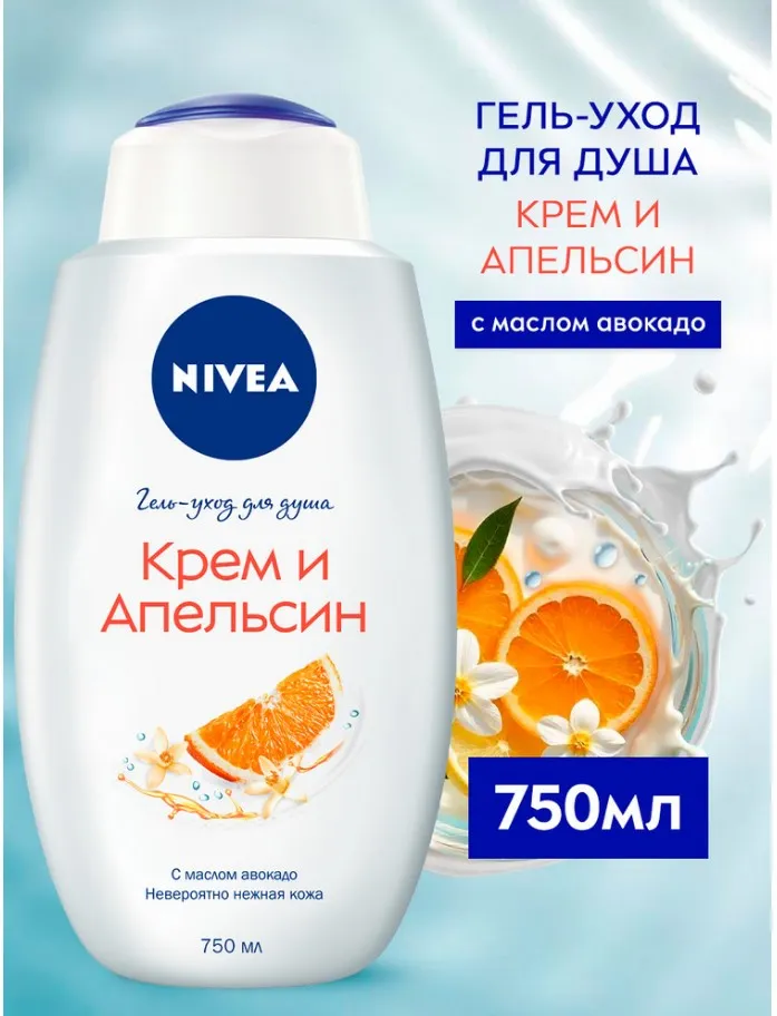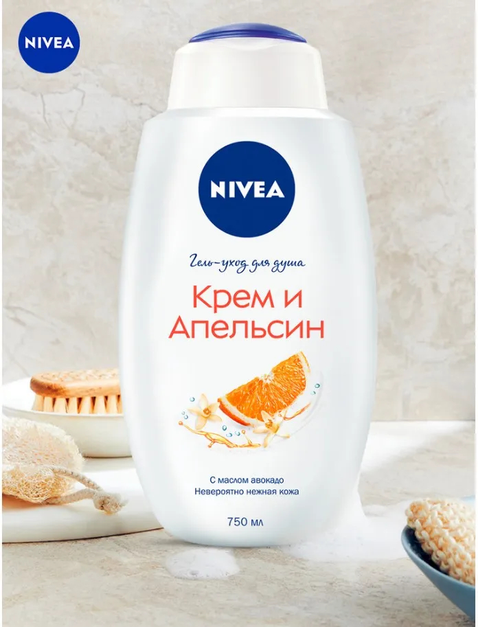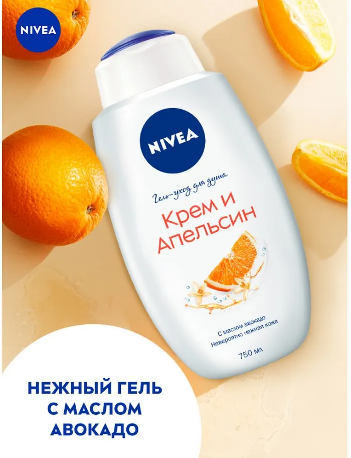 Попробуйте гель-уход для душа «Крем и Апельсин» с маслом авокадо для всех типов кожи от NIVEA. Гель для душа с натуральным маслом авокадо заботится о коже, делая ее невероятно мягкой. Нежный аромат апельсина пробудит Ваши чувства и подарит ощущение заботы о Вашей коже. Превратите ежедневное принятие душа в момент истинного наслаждения и заботы о себе. Для ежедневного применения. pH-сбалансировано. Дерматологически протестировано. Можно использовать с мочалкой для скрабирования кожи.