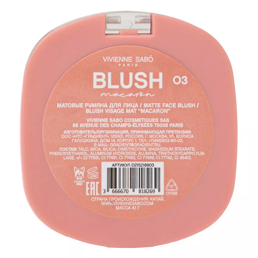 Румяна доступны в четырех оттенках: 01 персиковом, 02 холодно-розовом, 03 нежно-розовом, 04 натурально-розовом. Позволь им оживить твой образ и добавить в него сладкое волшебство. В макияже с MACARON от VIVIENNE SABÓ ты выглядишь, как самое вкусное угощение, готовое растопить сердца вокруг.
