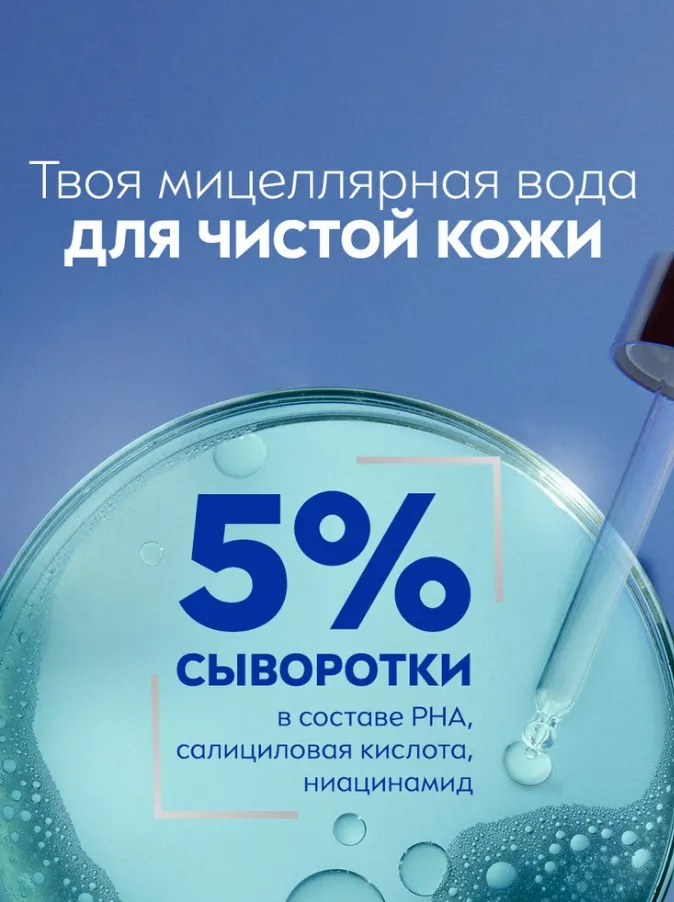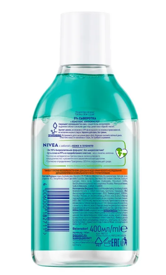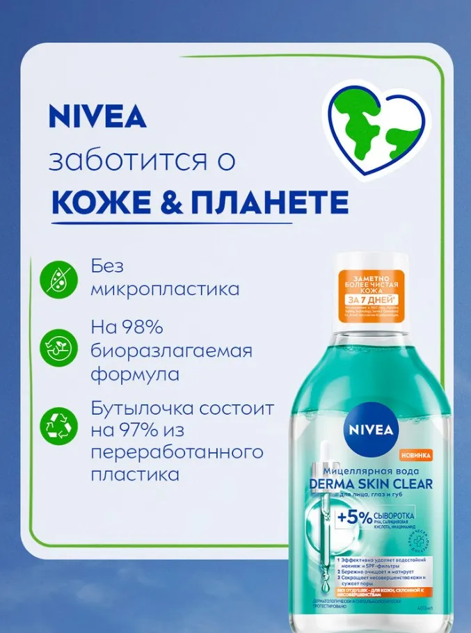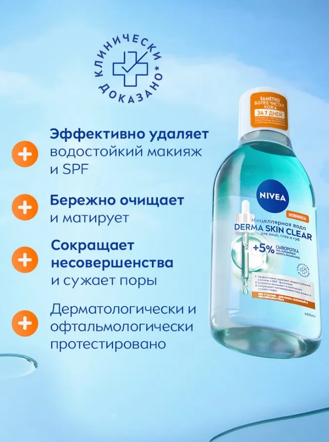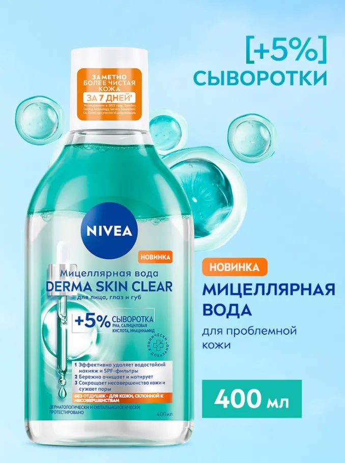 ПОПРОБУЙТЕ НОВИНКУ'! Мицеллярная вода NIVEA DERMA SKIN CLEAR 400 мл — это бережное очищение для кожи, склонной к несовершенствам. Уже через 7 дней кожа становится заметно более чистой* благодаря формуле с 5% активной сыворотки, включающей PHA кислоты, салициловую кислоту и ниацинамид. Средство эффективно удаляет даже водостойкий макияж и SPF всего за несколько прикосновений, не оставляя жирных следов и не требуя трения.