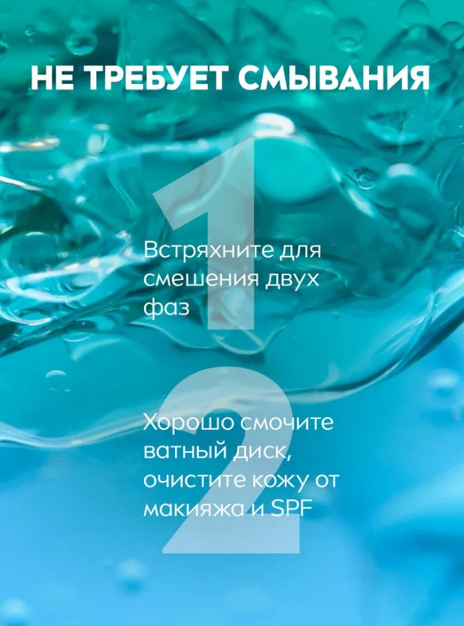 ПРИМЕНЕНИЕ: Встряхните для смешения двух фаз. Хорошо смочите ватный диск, очистите кожу от макияжа и туши, не требует смывания