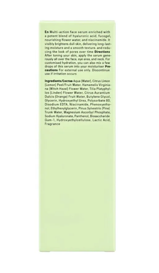 Вода, Гидролат Лимона, Экстракт Гамамелиса виргинского, Гидролат Липы, Гидролат Апельсина, Бутиленгликоль, Глицерин, Гидроксиэтил Мочевина, Полисорбат 80, Динатрий ЭДТА, Ниацинамид, Феноксиэтанол, Этилгексилглицерин, Экстракт Сосны, Аскорбилфосфат Магния, Гиалуронат Натрия, Пантенол, Биосахаридная смола, Гидроксиэтилцеллюлоза, Молочная Кислота, Отдушка