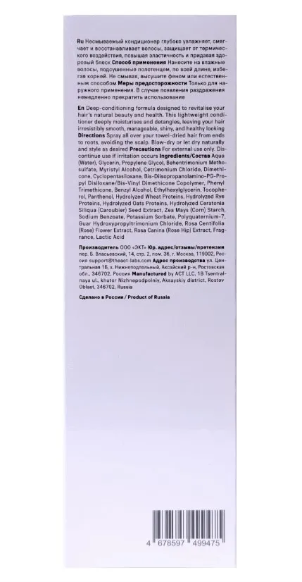 Вода, Глицерин, Пропиленгликоль, Бегентримония Метосульфат, Цетеариловый Спирт, Миристиловый Спирт, Диметикон, Циклометикон, Сополимер Бис-Диизопропаноламино-Pg-Пропилдисилоксана/Бис-Винилдиметикона, Фенилтриметикон, Бензиловый Спирт, Этилгексилглицерин, Пантенол, Гидролизованные Протеины Пшеницы, Гидролизованные Протеины Ржи, Гидролизованные Протеины Овса, Экстракт Рожкового Дерева, Кукурузный Крахмал, Натрия Бензоат, Калия Сорбат, Поликватерниум-7, Гуар Гидроксипропилтримония Хлорид, Экстракт Розы, Экстракт Шиповника, Отдушка, Лимонная кислота