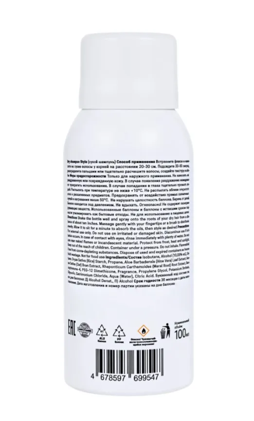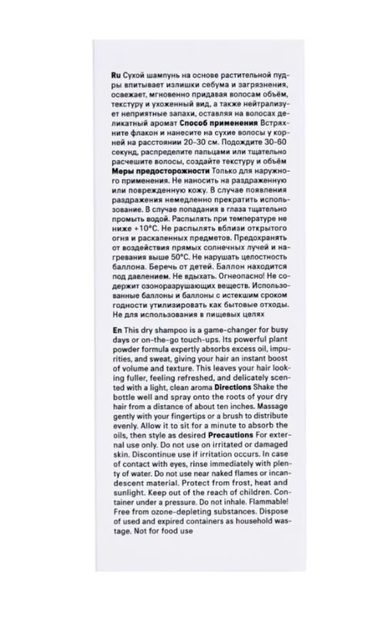 Сухой шампунь на основе растительной пудры впитывает излишки себума и загрязнения, освежает, мгновенно придавая волосам объём, текстуру и ухоженный вид, а также нейтрализует неприятные запахи, оставляя на волосах деликатный аромат