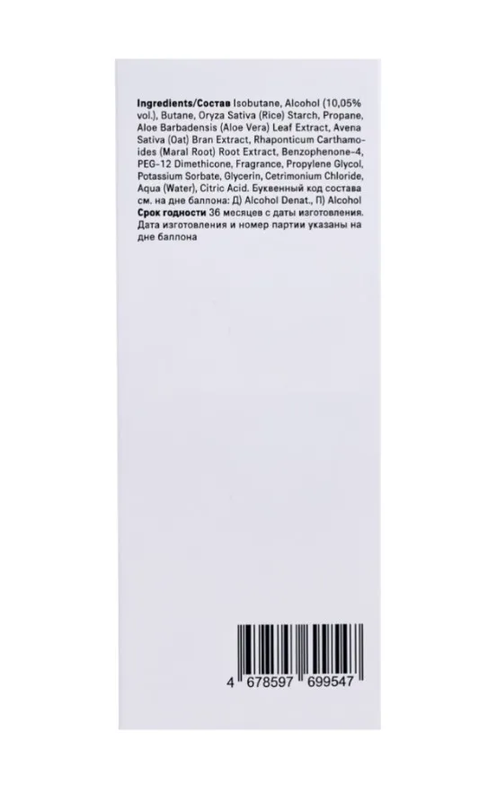Изобутан, Спирт (10%), Бутан, Рисовый Крахмал, Пропан, Экстракт Алое Вера, Экстракт Овса, Экстракт Маральего Корня, Бензофенон-4, Диметикон ПЭГ-12, Отдушка, Пропиленгликоль, Сорбат Калия, Глицерин, Цетримониум Хлорид, Вода, Лимонная Кислота