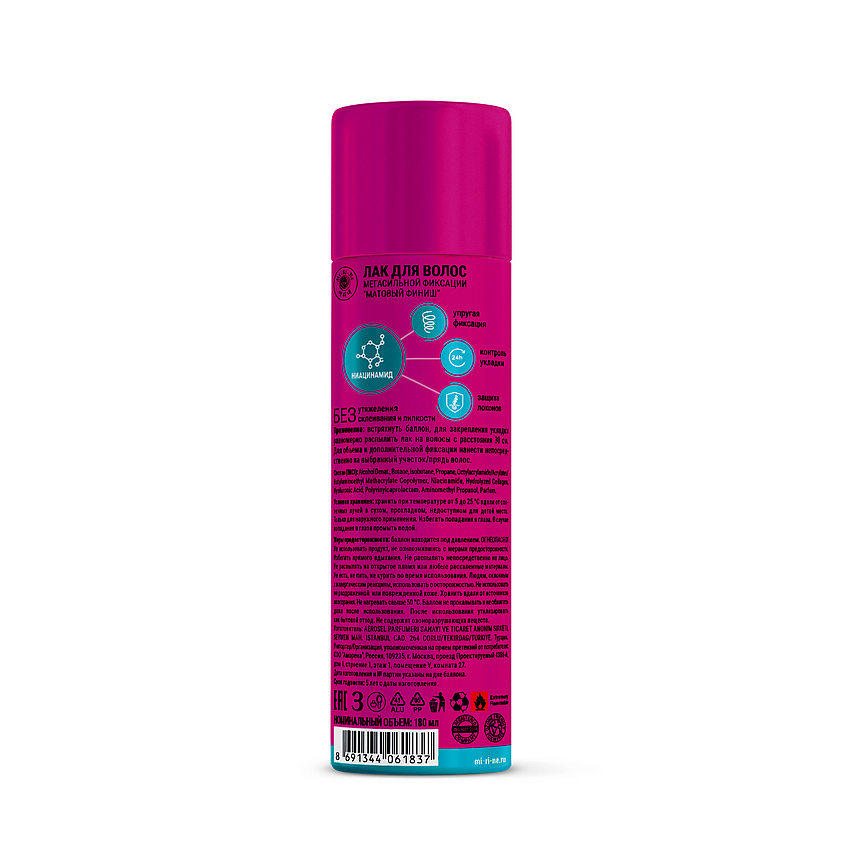 Лак для волос мегасильной фиксации «МАТОВЫЙ ФИНИШ» помогает легко создать укладку и сохранить прическу на целый день. Лак моментально фиксирует пряди, при этом не склеивает и не утяжеляет волосы, придает матовый финиш. Прическа выглядит максимально естественной. Формула с ниацинамидом способствует защите волос, предотвращая повреждения.