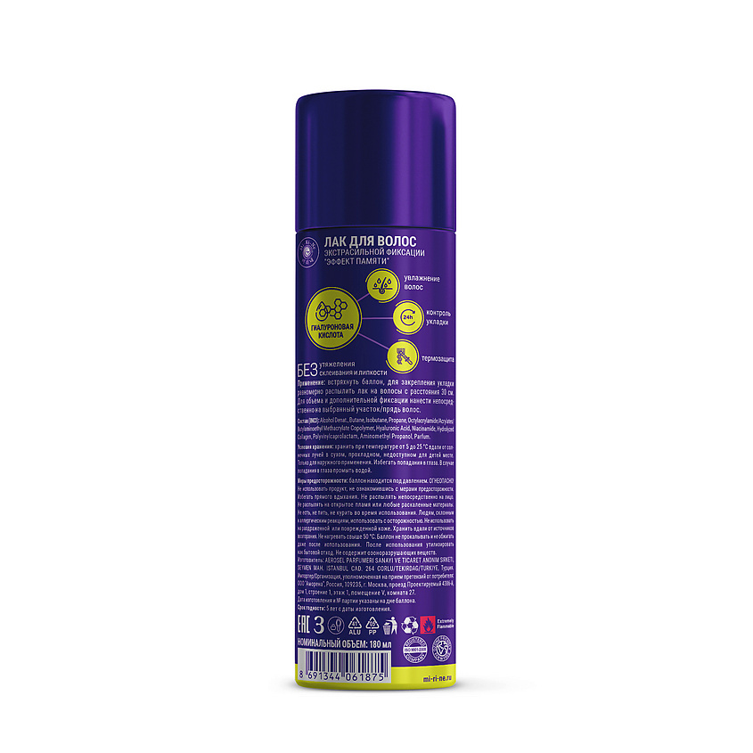 Лак для волос экстрасильной фиксации «ЭФФЕКТ ПАМЯТИ» помогает создать укладку и сохранить прическу до 24 ч. Экстрасильная фиксация позволяет прическе оставаться в первоначальном виде весь день и даже вечер. Формула с гиалуроновой кислотой способствует увлажнению и смягчению волос, оказывает термозащитное действие, образуя на поверхности волоса защитную пленку. Лак для волос не только надежно фиксирует волосы, но и ухаживает за ними.