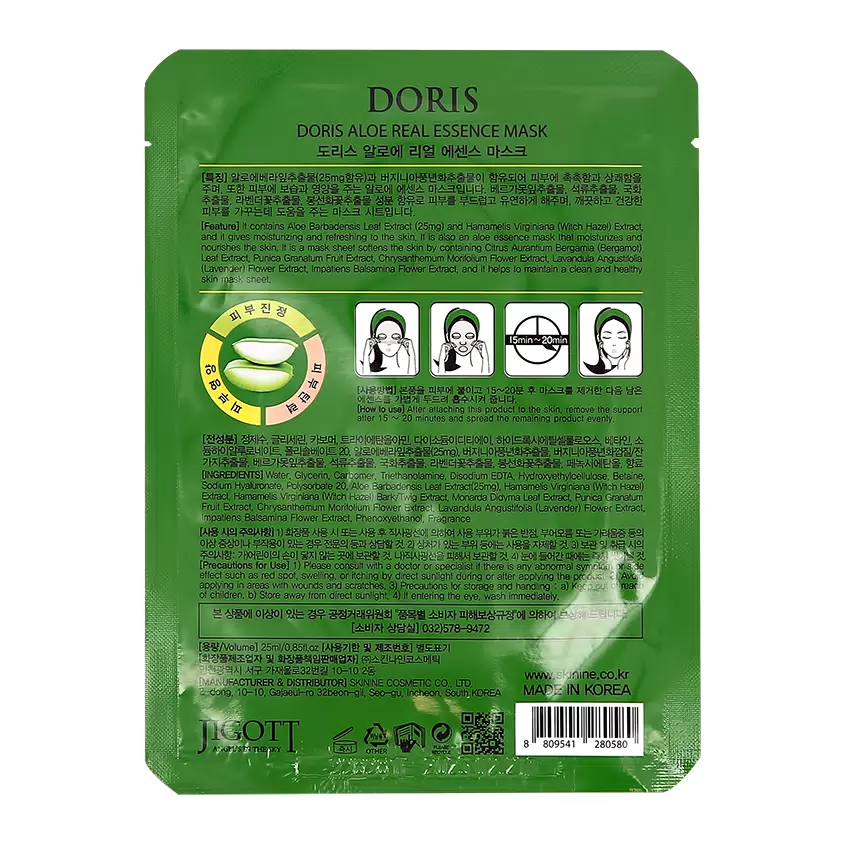 Состав эссенции, которой пропитана маска Doris, содержит экстракты листьев алое (25mg) и гамамелиса, они успокаивают и тонизируют кожу, обладают противовоспалительными свойствами, уменьшают зуд и раздражение на коже. Гиалуроновая кислота и бетаин в составе смягчают и дополнительно удерживают влагу в коже, разглаживают и успокаивают кожу. Комплекс из экстрактов монарды, граната, хризантемы и лаванды успокаивает кожу, оказывает антиоксидантное действие и улучшает цвет лица.
