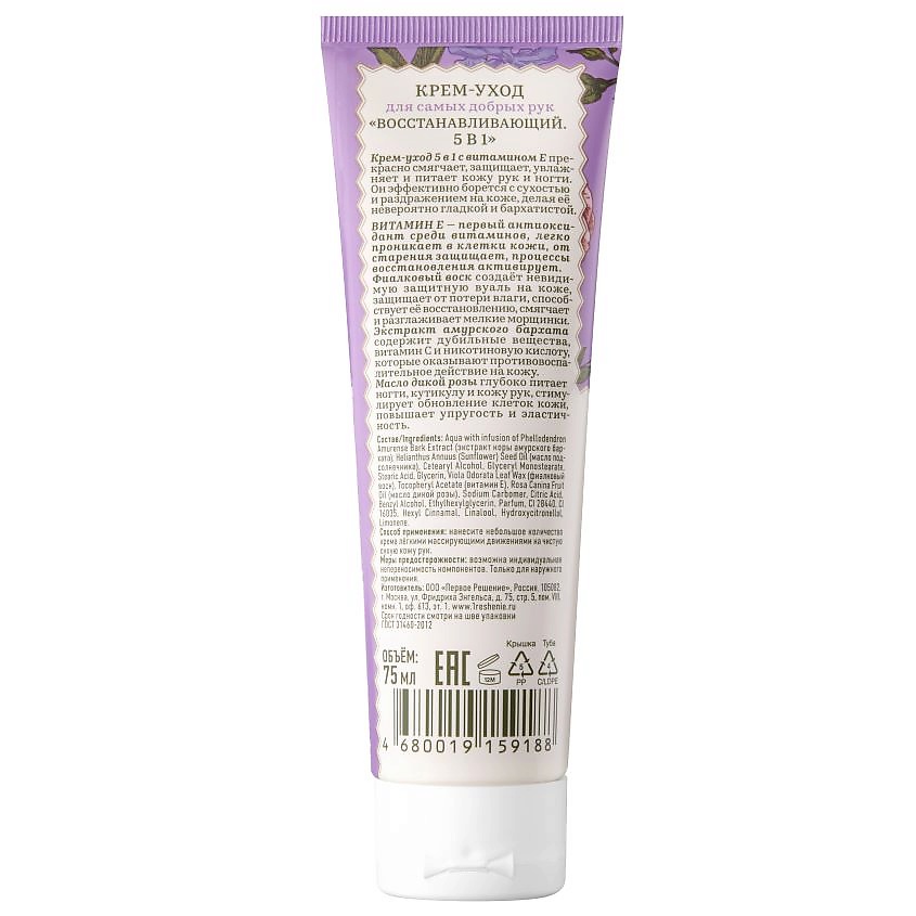 Крем-уход "Рецепты бабушки Агафьи" для самых добрых рук восстанавливающий 5 в 1, 75 мл, идеально подходит для всех типов кожи, обеспечивая комплексный уход. Формула обогащена экстрактами медуницы и облепихи, которые питают, увлажняют и восстанавливают кожу, возвращая ей мягкость и эластичность. Легкая текстура быстро впитывается, не оставляя жирных следов, и образует защитный барьер от агрессивных внешних факторов. Уникальные компоненты помогают заживлять мелкие трещинки и предотвращать сухость, обеспечивая полноценный уход, чтобы ваши руки всегда оставались нежными и ухоженными.