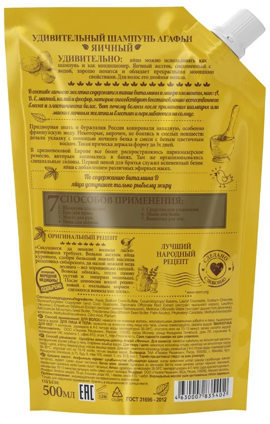 УДИВИТЕЛЬНАЯ СЕРИЯ АГАФЬИ шампунь д/волос яичный мяг.уп. 500мл 5402