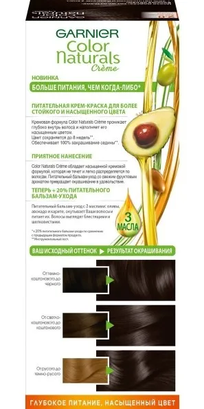 Крем-краска Garnier Color Naturals содержит масла оливы, авокадо и карите, которые питают волосы во время окрашивания. В результате цвет получается насыщенным и стойким, а волосы становятся мягкими и шелковистыми. 100% закрашивание седины. .
