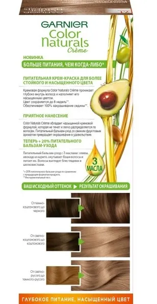 Крем-краска Garnier Color Naturals содержит масла оливы, авокадо и карите, которые питают волосы во время окрашивания. В результате цвет получается насыщенным и стойким, а волосы становятся мягкими и шелковистыми. 100% закрашивание седины.