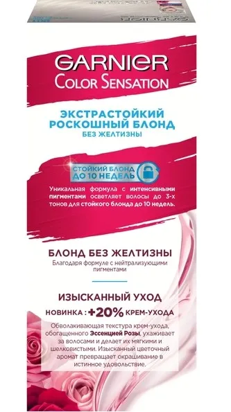 Garnier "Color Sensation" стойкая крем-краска с перламутром и цветочным маслом. Уникальная формула содержит Интенсивные пигменты для роскошного результата: выразительный, экстрастойкий и точный (результат зависит от исходного оттенка волос) цвет. Волосы переливаются и отражают свет благодаря содержанию перламутра и цветочных масел.