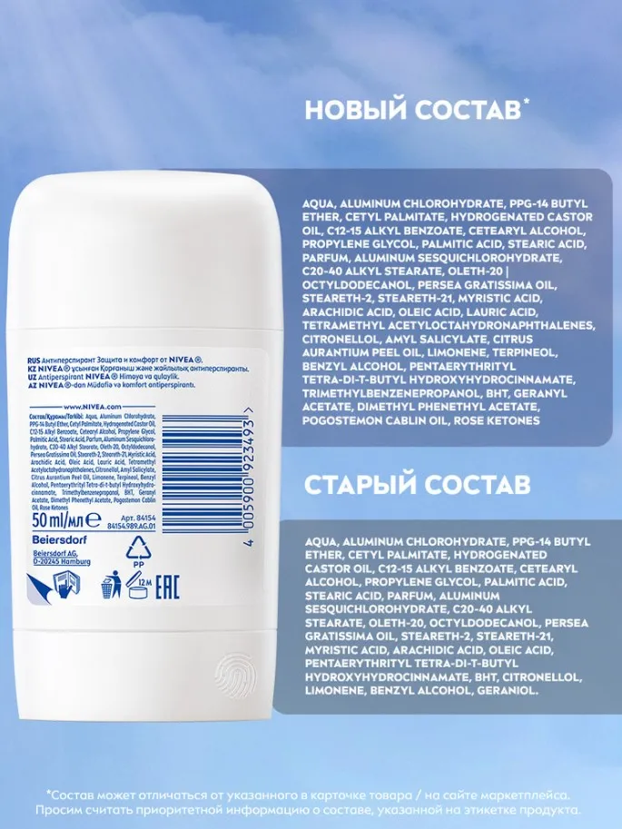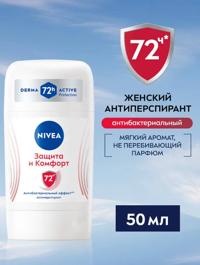 Попробуйте дезодорант-антиперспирант стик "Защита и комфорт" от NIVEA с усиленной формулой, которая защищает благодаря двум активным компонентам и дарит мягкий уход. Антиперспирант обладает антибактериальным эффектом** и обеспечивает защиту от запаха пота на 72 часа*. Нежная текстура позволяет нанести продукт тонким слоем в 1-2 движения. При нанесении на кожу текстура ощущается немного влажной, но быстро высыхает. Дерматологически протестировано. Не содержит этиловый спирт.