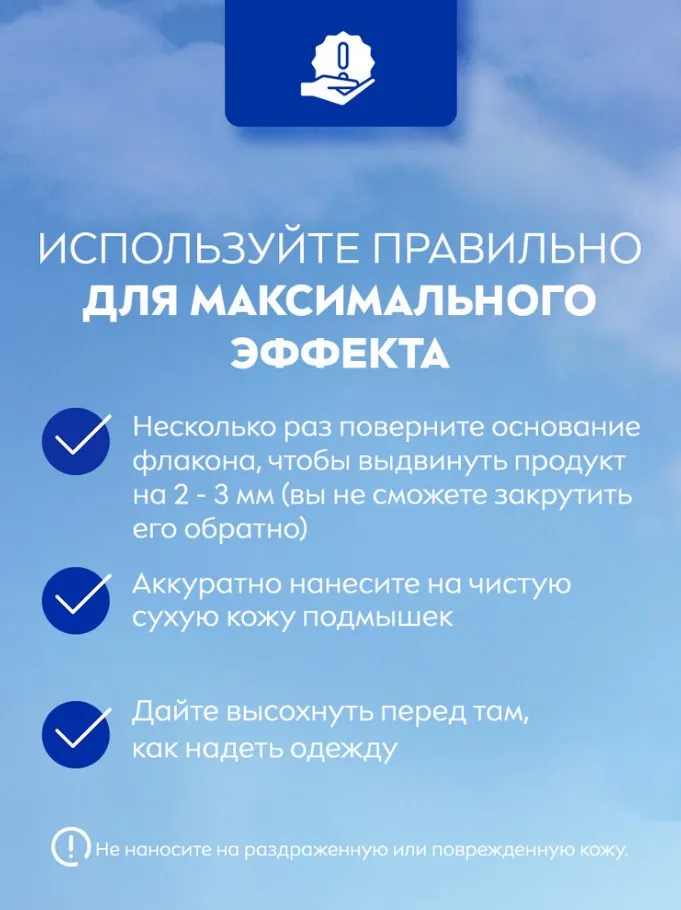 Способ применения: Несколько раз поверните основание флакона, чтобы выдвинуть продукт на 2 - 3 мм (вы не сможете закрутить его обратно), аккуратно нанесите на чистую сухую кожу подмышек, дайте высохнуть перед там, как надеть одежду. Подходит для ежедневного использования. Не наносить на поврежденную или раздраженную кожу.