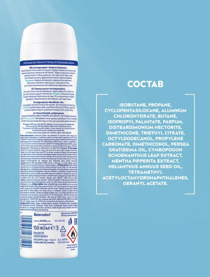 Попробуй дезодорант-антиперспирант спрей для женщин NIVEA «Энергия свежести» и ощути свежий аромат лемонграсса и заряд свежести на целый день. Дарит ощущение свежести, которое остается с Вами дольше, чем просто на пару часов. Антиперспирант борется с бактериями**, вызывающими запах пота и обеспечивает надежную защиту от неприятного запаха на 48 часов*. Антиперспирант быстро высыхает, не оставляя ощущения липкости на коже. Без этилового спирта в составе. Дерматологически протестировано.