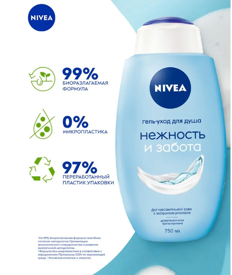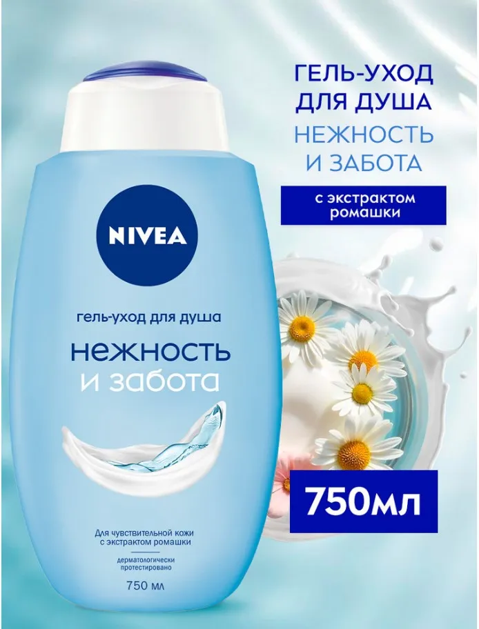 Попробуйте гель-уход для душа «Нежность и забота» для чувствительной кожи от NIVEA. Испытайте ощущение настоящей нежности с гелем для душа от NIVEA. Гель-уход с экстрактом ромашки дарит ощущение увлажненной и здоровой кожи, а шелковистая пена окутывает Вас, оставляя нежный аромат. Превратите ежедневное принятие душа в момент истинного наслаждения и заботы о себе и своем теле. Можно использовать с мочалкой для скрабирования кожи. pH-сбалансировано*. Не содержит микропластик**. Дерматологически протестировано.