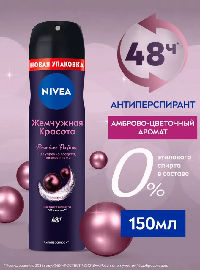Дезодорант-антиперспирант спрей для женщин NIVEA «Жемчужная красота. Premium Perfume» и его формула с экстрактом черного жемчуга обеспечивает надёжную защиту от потоотделения и неприятного запаха на 48 часов*. Антиперспирант имеет премиальный стойкий амброво-цветочный аромат. Для гладкой и сияющей кожи подмышек. Слишком красивых, чтобы их прятать! Дезодорант-антиперспирант быстро высыхает и защищает от неприятного запаха на 48 часов*. Без ощущения липкости на коже. Дерматологически протестировано. Уже более 100 лет NIVEA создает особенно бережные для кожи формулы. Попробуй нежный уход за кожей от антиперспиранта NIVEA без этилового спирта!