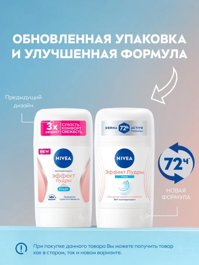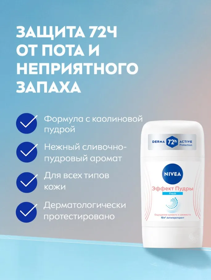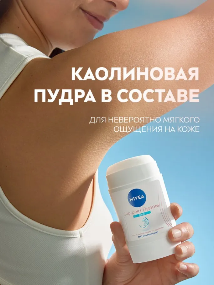 Дезодорант-антиперспирант стик "Эффект пудры" Fresh от NIVEA с эмульсионной технологией предлагает надёжную защиту от пота и неприятного запаха на 72 часа*. Формула с каолиновой пудрой дарит ощущение бархатной кожи и свежести, а текстура делает возможным легкое и бережное нанесение. Испытайте чувство свежести без ощущения липкости с нежным свежим пудровым ароматом. Дерматологически протестированная формула без содержания этилового спирта заботится о вашей коже.