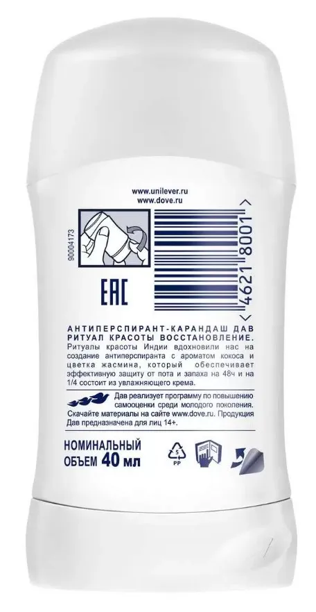 Попробуйте новинку – антиперспирант Dove Ритуал Красоты Восстановление с кремовым ароматом кокоса и цветка жасмина! Вдохновленный ритуалами индийских женщин, этот утонченный аромат переносит нас во времена зарождения традиции нанесения кокосового масла на кожу, а особая* мягкая формула без спирта**, содержащая ? увлажняющего крема,