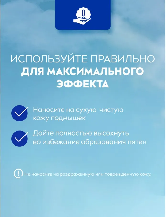 Способ применения: нанести на чистую сухую область подмышек. Дать полностью высохнуть во избежание образования пятен на одежде. Не наносить на поврежденную или раздраженную кожу.