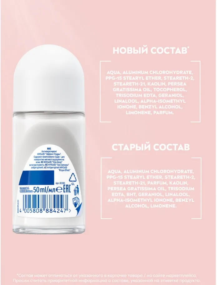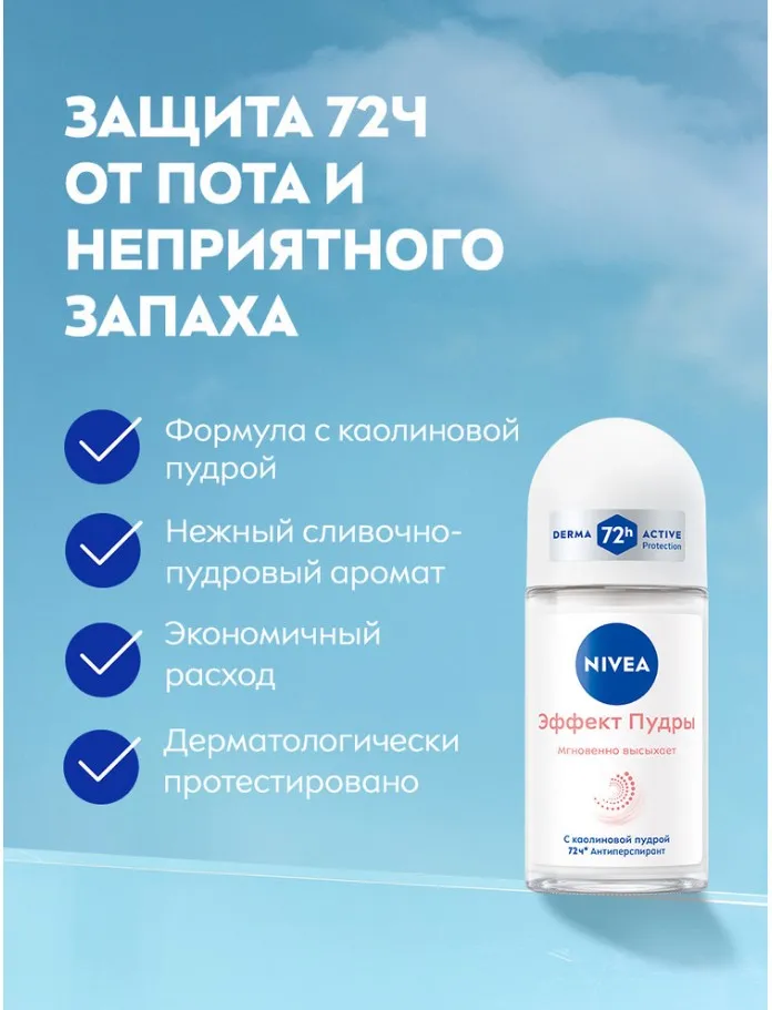 Шариковый дезодорант-антиперспирант спрей NIVEA «Эффект Пудры» сочетает в себе надежную защиту антиперспирирующей формулы и невероятную мягкость уникального природного компонента - каолиновой пудры. Каолин, также известный как Белая глина, обладает отличными абсорбирующими и обволакивающими свойствами, поэтому сразу после нанесения дезодорант мгновенно высыхает, не оставляя липких ощущений на коже, и придает ей невероятную мягкость. Роликовый дезодорант-антиперспирант защищает от неприятного запаха пота на 72 часа*. Без ощущения липкости на коже. Обладает нежным ароматом сливочных и ярких пудровых ноток. Дерматологически протестировано. Экономичный расход: шариковый антиперспирант даёт в 2 раза больше применений, чем спрей!**