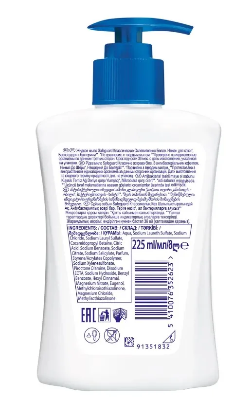 Мыло Safeguard защищает от бактерий даже после смывания! Антибактериальное мыло Safeguard "Классическое Ослепительно Белое" в удобной жидкой форме защищает от болезнетворных бактерий даже после смывания и подходит для ежедневного использования. Клинически доказано. "Это мыло - просто находка! Отличная защита от микробов, не вызывае