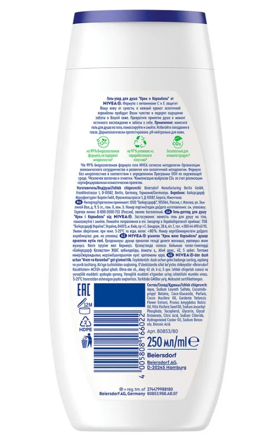 Применение: нанесите гель для душа на тело, помассируйте и смойте водой комфортной температуры. Избегайте попадания в глаза. Нанесите бальзам, молочко или лосьон для тела от NIVEA на чистую и сухую кожу тела для дополнительного увлажнения.