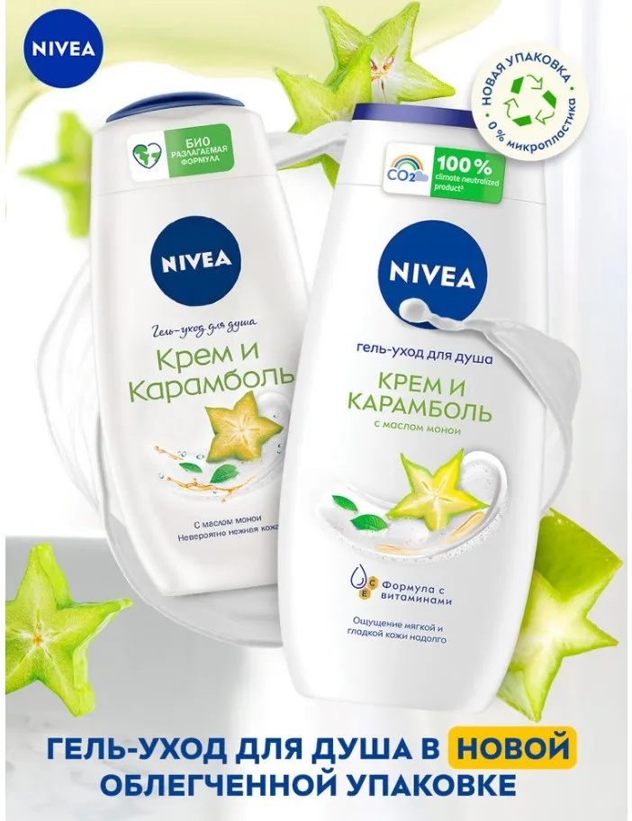 Попробуйте гель-уход для душа «Крем и Карамболь» с маслом монои для всех типов кожи от NIVEA. Формула с витаминами C и Е защитит Вашу кожу от сухости, а нежный аромат экзотичной карамболы пробудит Ваши чувства и подарит ощущение заботы о Вашей коже. Превратите ежедневное принятие душа в момент истинного наслаждения и заботы о себе. pH-нейтрально для кожи. Дерматологически протестировано. Можно использовать с мочалкой для скрабирования кожи.