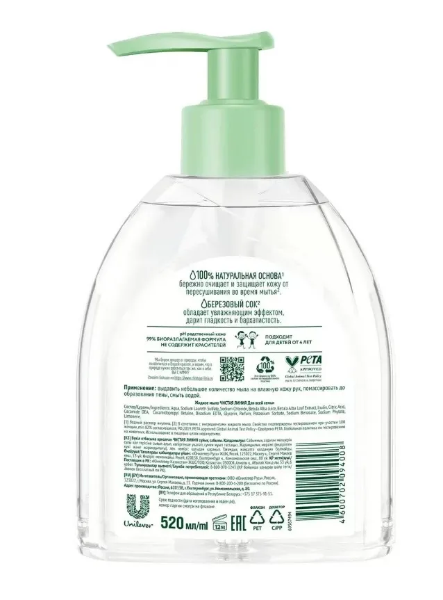 Жидкое мыло Чистая линия Для всей семьи Березовое обеспечивает бережный уход за кожей, смягчая и тонизируя ее. Натуральные компоненты мягко очищают, дарят гладкость и бархатистость. Подходит для детей от 3-х лет. Результат: кожа мягко очищена и увлажнена.До сих пор на нашей планете не было создано силы более сбалансированной, могущ