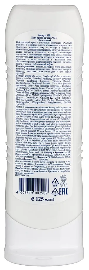 Специальная разработка компании "Флоресан" для тех, кому необходимо отбеливание кожи. При этом крем содержит сильнейший защитный комплекс против солнца SPF 35, что позволяет сохранить здоровье и отбелить кожу одновременно, по принципу 2 в 1.В состав крем против загара "Флоресан" включены экстракты огурца, петрушки и хрена, а также