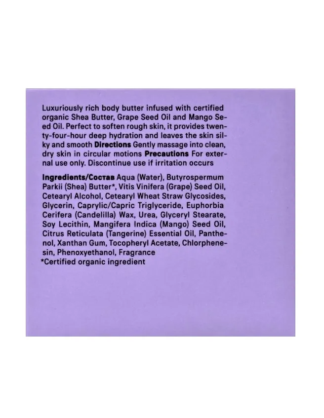 Вода, Баттер Ши, Масло Виноградной Косточки, Цетеариловый Спирт, Пшеничный Эмульгирующий Воск, Глицерин, Каприлик/Каприк Триглицериды, Канделильский Воск, Мочевина, Глицерил Стеарат, Соевый Лецитин, Масло Семян Манго, Эфирное Масло Мандарина, Пантенол, Ксантановая Камедь, Токоферил Ацетат, Хлорфенезин, Феноксиэтанол, Отдушка