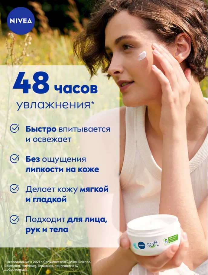 Интенсивный увлажняющий крем NIVEA Soft разработан для ежедневного ухода за кожей лица, рук и тела. Новая улучшенная формула* увлажняет 48 часов**. Благодаря легкой текстуре с Витамином Е и Маслом Жожоба крем быстро впитывается и дарит Вашей коже ощущение нежности. Универсальный крем NIVEA Soft подходит для всех типов кожи. Попробуйте Интенсивный увлажняющий крем Soft от NIVEA и ощутите длительное освежающее увлажнение кожи.