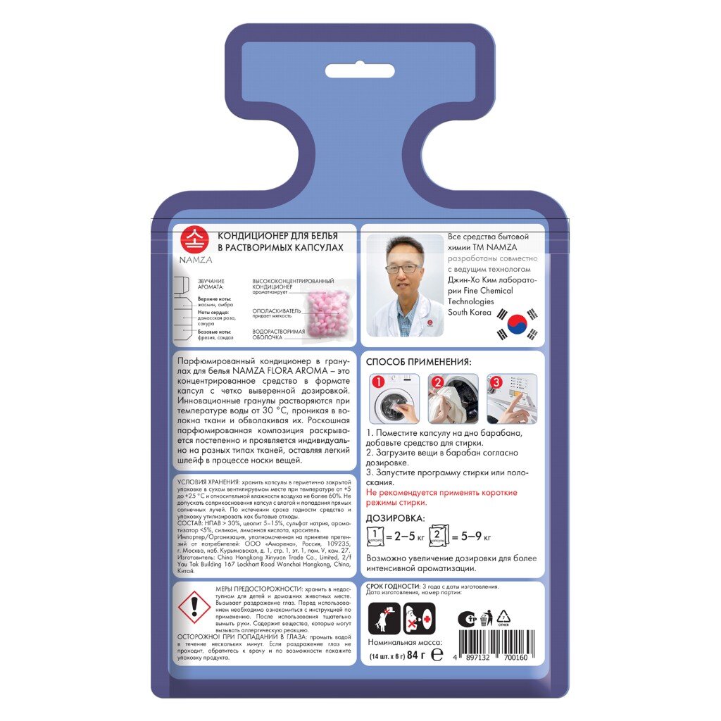 Парфюмированный кондиционер в гранулах для белья NAMZA FLORA AROMA - это концентрированное средство в формате капсул с четко выверенной дозировкой. Инновационные гранулы растворяются при температуре воды от 30 °С, проникая в волокна ткани и обволакивая их. Роскошная парфюмированная композиция раскрывается постепенно и проявляется индивидуально на разных типах тканей, оставляя легкий шлейф в процессе носки вещей.