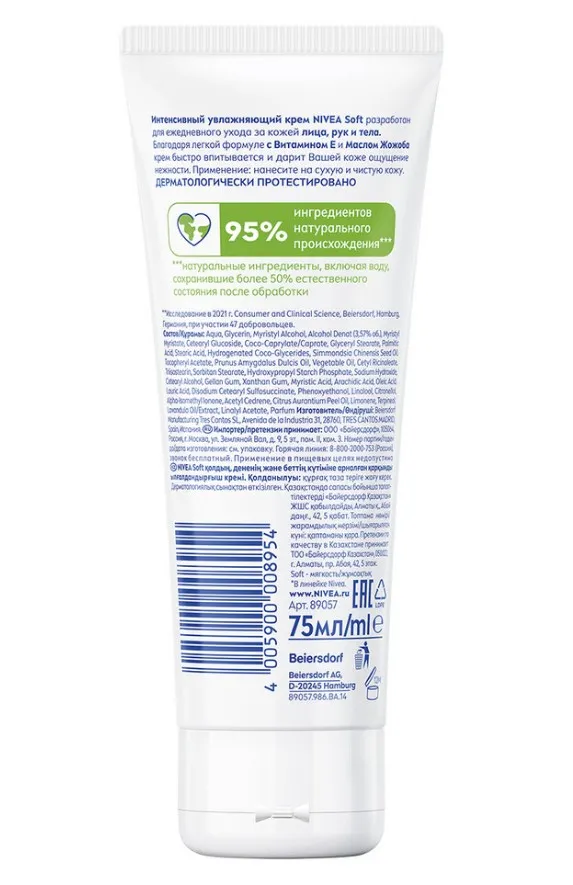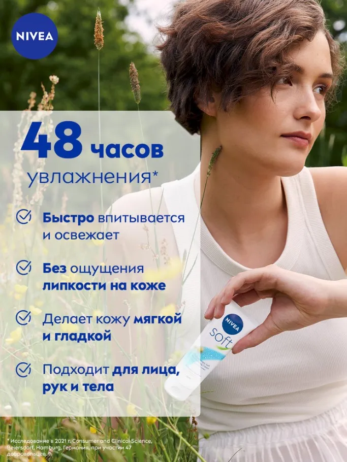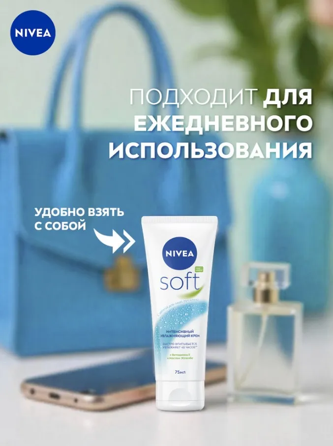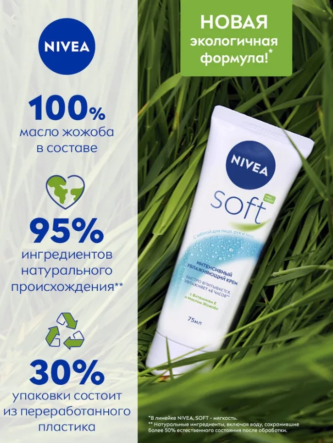 Интенсивный увлажняющий крем NIVEA Soft разработан для ежедневного ухода за кожей лица, рук и тела. Новая улучшенная формула* увлажняет 48 часов**. Благодаря легкой текстуре с Витамином Е и Маслом Жожоба крем быстро впитывается и дарит Вашей коже ощущение нежности. Универсальный крем NIVEA Soft подходит для всех типов кожи. Попробуйте Интенсивный увлажняющий крем Soft от NIVEA и ощутите длительное освежающее увлажнение кожи.