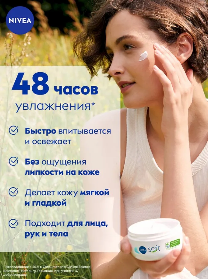 Интенсивный увлажняющий крем NIVEA Soft разработан для ежедневного ухода за кожей лица, рук и тела. Новая улучшенная формула* увлажняет 48 часов**. Благодаря легкой текстуре с Витамином Е и Маслом Жожоба крем быстро впитывается и дарит Вашей коже ощущение нежности. Универсальный крем NIVEA Soft подходит для всех типов кожи. Попробуйте Интенсивный увлажняющий крем Soft от NIVEA и ощутите длительное освежающее увлажнение кожи.