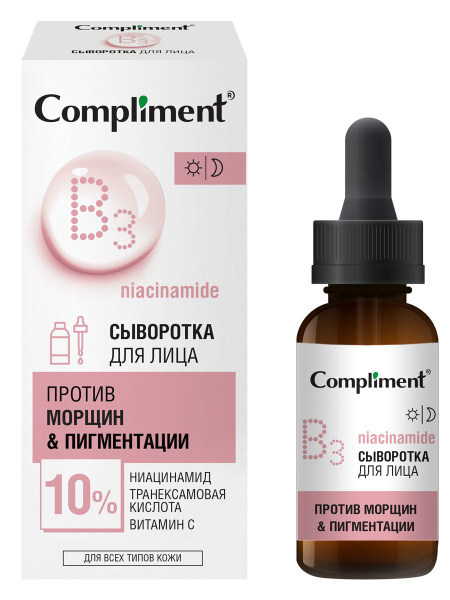 Сыворотка для лица ПРОТИВ МОРЩИН И ПИГМЕНТАЦИИ с ниацинамидом, витамином С и транексамовой кислотой НИАЦИНАМИД регулирует транспортировку меланина к поверхности кожи. Способствует осветлению пигментных пятен и препятствует их повторному появлению, обеспечивая стойкий выравнивающий эффект. ВИТАМИН С -мощный антиоксидант. Предотвращает повреждение клеток свободными радикалами, укрепляя собственную защиту микробиома кожи. Запускает процессы обновления, оказывает регенерирующее действие, способствует выравниванию микрорельефа кожи. ГИАЛУРОНОВАЯ КИСЛОТА обеспечивает интенсивное увлажнение, повышает упругость и эластичность эпидермиса. Обладает регенерирующими и смягчающими свойствами, препятствует образованию морщин обезвоженности. ТРАНЕКСАМОВАЯ КИСЛОТА –улучшает процесс клеточной регенерации, помогает осветлить пигментацию и сделать цвет лица более ровным. Сыворотка на водной основе имеет невесомую текстуру для оптимального проникновения в эпидермис, подходит для использования в качестве праймера или базы под макияж с антипигментным действием