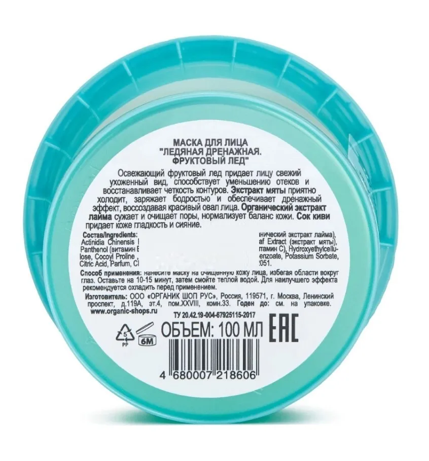 Освежающий фруктовый лед придает лицу свежий ухоженный вид, способствует уменьшению отеков и восстанавливает четкость контуров. Экстракт мяты приятно холодит, заряжает бодростью и обеспечивает дренажный эффект, воссоздавая красивый овал лица. Органический экстракт лайма сужает и очищает поры, нормализует баланс кожи. Сок киви прида