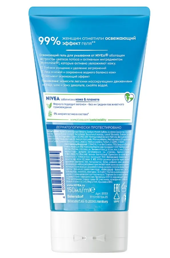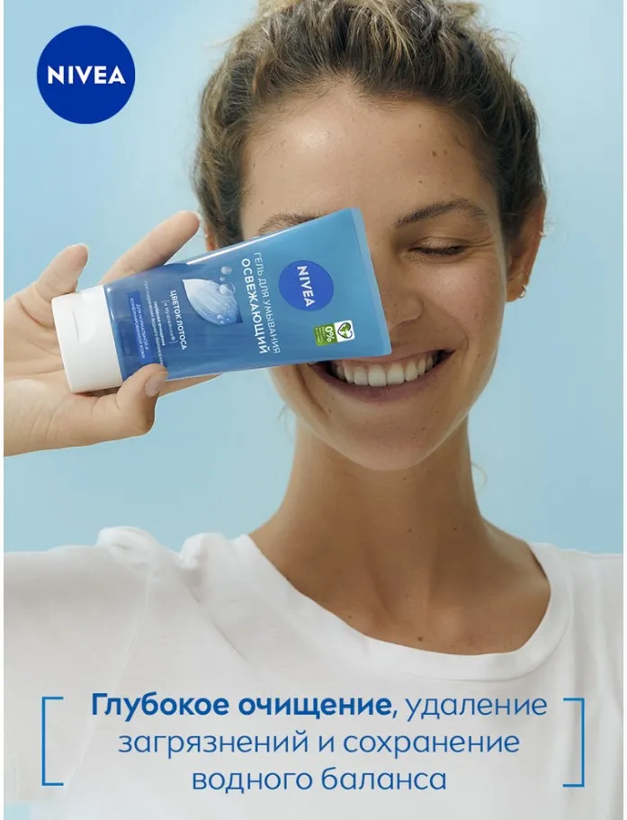 Освежающий гель для умывания от NIVEA обогащен экстрактом цветков лотоса и активным ингредиентом Hydramine, которые активно увлажняют кожу. Гель подходит для нормальной и комбинированной кожи лица и обеспечивает глубокое очищение и удаление загрязнений, уход за кожей и сохранение водного баланса кожи, оказывает освежающий эффект. 99% женщин отметили освежающий эффект геля*. Дерматологически протестировано. NIVEA заботится о коже и планете. 0% микропластика в составе**.