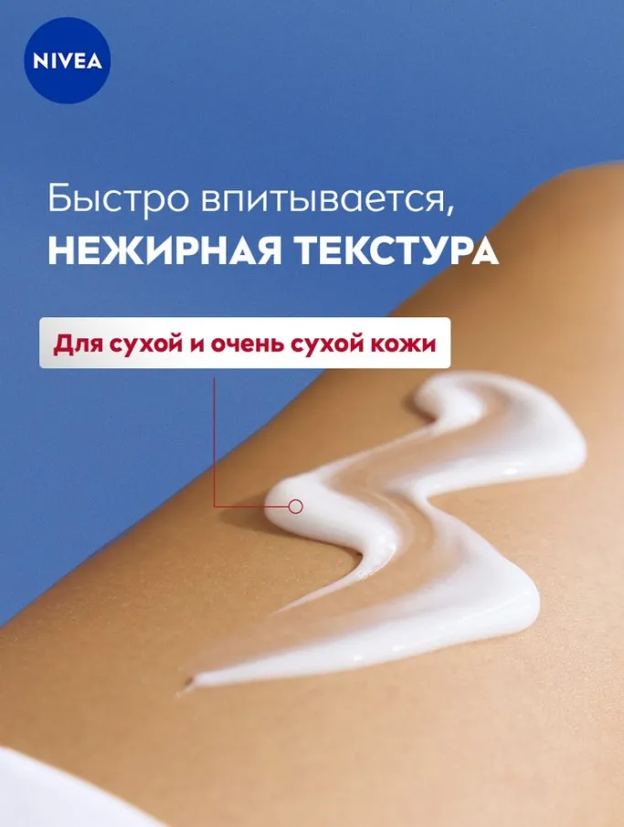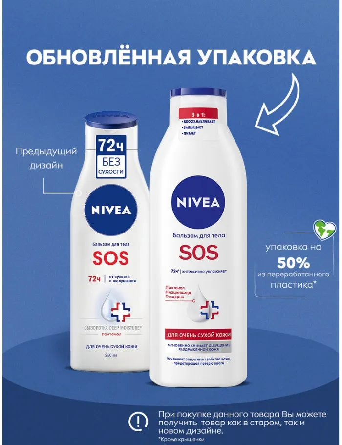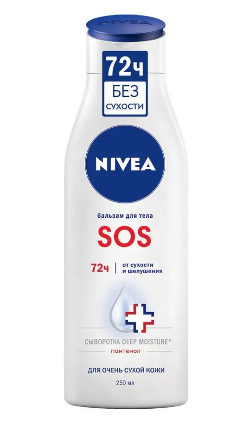 Бальзам для тела “SOS” от NIVEA обеспечивает глубокое увлажнение кожи тела на 72 часа'. Улучшенная формула* с Пантенолом, Ниацинамидом и Глицерином мгновенно успокаивает, снимает ощущение раздраженной кожи, обеспечивая комплексный уход. Бальзам усиливает способность кожи удерживать влагу. Средство обладает нежирной текстурой и быстро впитывается. Дерматологически протестировано.