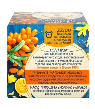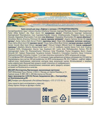 В ночном креме для лица Сто Рецептов Красоты Лифтинг и питание мы используем натуральные продукты, которые питают кожу и замедляют процессы старения клеток. Масло облепихи, пчелиное маточное молочко, масло первоцвета и витамины А и Е – улучшенный рецепт для более эффективного антивозрастного ухода в холодное время года!
