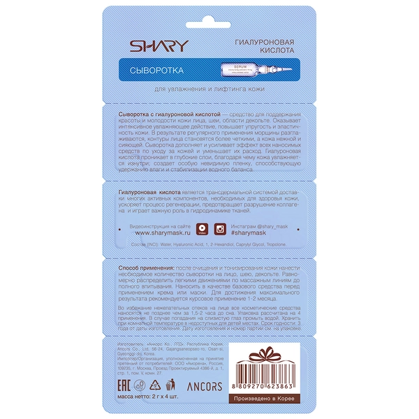 Сыворотка Shary с гиалуроновой кислотой - средство для поддержания красоты и молодости кожи лица, шеи, области декольте. Сыворотка оказывает интенсивное увлажняющее действие, восстанавливает водный баланс, повышает упругость кожи, разглаживает морщины, защищает от потери влаги. В результате регулярного применения морщины разглаживаются, контуры лица становятся более четкими, а кожа нежной и сияющей. Низкомолекулярная гиалуроновая кислота проникает в глубокие слои, благодаря чему кожа увлажняется изнутри, создает особую невидимую пленку, способствующую удержанию влаги и стабилизации водного баланса. Гиалуроновая кислота является трансдермальной системой доставки многих активных компонентов, необходимых для здоровья кожи, ускоряет процесс регенерации, предотвращает разрушение коллагена и играет важную роль в гидродинамике тканей. Упаковка представляет собой саше разделенное перфорацией на 4 применения по 2 г.