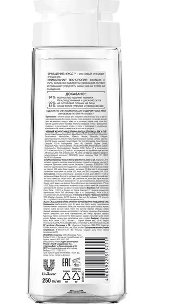 Мицеллярная вода для лица, век и губ Черный Жемчуг - ультрасовременное средство на основе микро-частичек-мицелл, которое не просто удаляет макияж одним движением, но и успокаивает и ухаживает за кожей с первой секунды. Благодаря формуле с 20% активной сыворотки мицеллярная вода Черный Жемчуг в линейке ОЧИЩЕНИЕ+УХОД увлажняет, питае