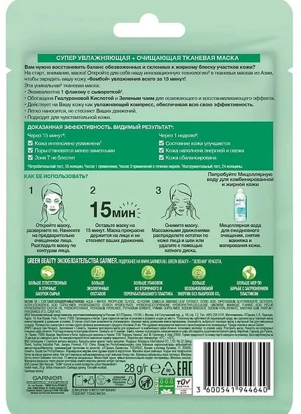 Тканевая маска, пропитанная гелем, обогащенным экстрактом зеленого чая, гиалуроновой кислотой и увлажняющей сывороткой. Нанесенная на лицо, маска действует как компресс, увлажняющий глубокие слои кожи. Тканевая маска мгновенно увлажняет кожу и дарит ощущение комфорта, как после массажа. Утоляет жажду кожи + Освежает, сужает поры. Э