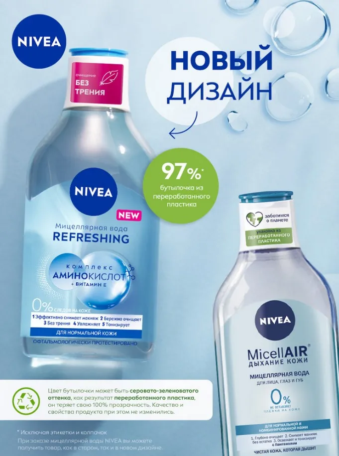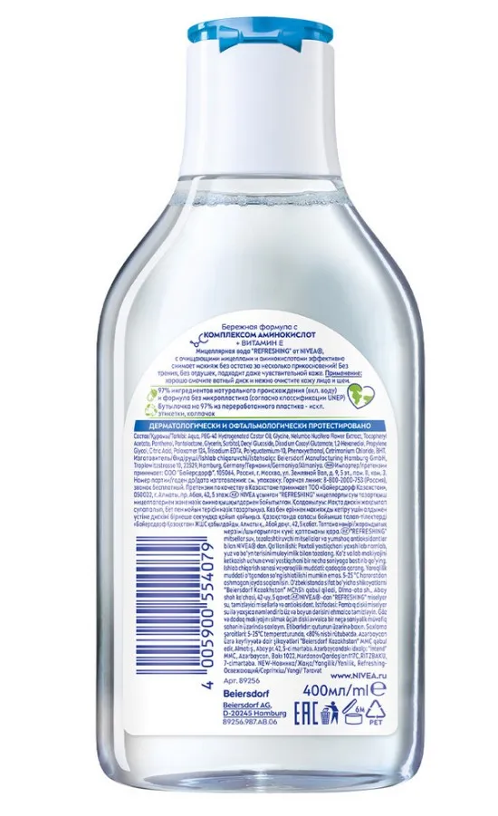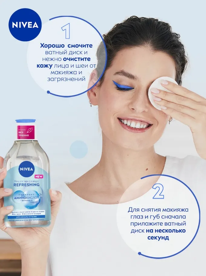 Мицеллярная вода REFRESHING для нормальной кожи для лица, глаз и губ от NIVEA создана с бережной формулой с комплексом аминокислот и витамином Е. Мицеллярная вода с очищающими мицеллами и аминокислотами эффективно снимает макияж без остатка за несколько прикосновений! Без трения, без отдушек, подходит даже для чувствительной кожи. Дерматологически и офтальмологически протестировано. 97% ингредиентов натурального происхождения (вкл. воду) и формула без микропластика (согласно классификации UNEP). Бутылочка на 97% из переработанного пластика, за исключением этикетки и колпачка. Флакон из переработанного пластика не такой прозрачный, как из первичного сырья, он может быть мутным и иметь серый, зеленый и желтый оттенки. Для снятия водостойкого макияжа с глаз рекомендуем попробовать средство для снятия макияжа с глаз «Двойной эффект» от NIVEA.