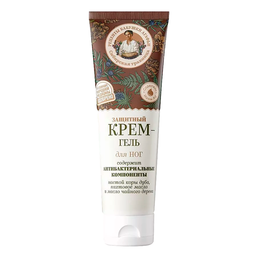 Крем-гель для ног "Рецепты бабушки Агафьи" защитный, 75 мл, идеально подходит для всех типов кожи, обеспечивая надежную защиту и уход. Формула обогащена натуральными экстрактами, такими как масло чайного дерева и экстракт эвкалипта, которые обладают антибактериальными свойствами, защищая кожу от бактерий и неприятного запаха.