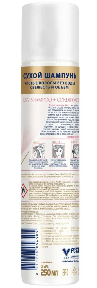 Делает волосы более чистыми без использования воды Волосы выглядят более красивыми, здоровыми* и густыми Можно использовать на чистых волосах или как вспомогательное средство для укладки Обладает свежим, легким ароматом *здоровый внешний вид волос Сухой шампунь Dove – это удобный и быстрый способ освежить волосы, когда нет возм
