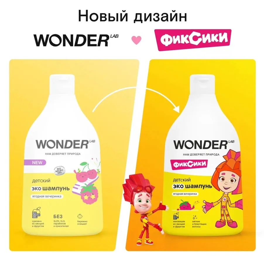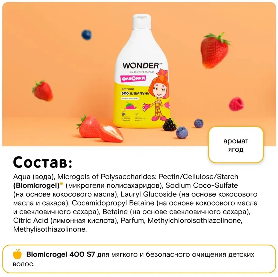 Детский шампунь WONDER LAB превратит купание вашего малыша в вечеринку с ароматом сочных и сладких ягод. Яркий дизайн привлечет внимание малыша, а мягкая формула поможет без неприятных впечатлений сформировать привычку мыть голову. Мягкая пенка экошампуня бережно очищает волосы и кожу головы, а безопасный состав без SLS, парабенов и красителей подходит с первых дней жизни и не вызовет аллергии. Подходит для ежедневного использования. После купания волосы малыша мягкие и блестящие, без шелушения кожи и других неприятных ощущений.
