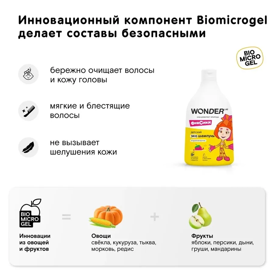 В основе шампуня для малышей - инновационный компонент Biomicrogel, который сделан из овощей и фруктов. Благодаря этому компоненту, средства WONDER LAB безопасны для человека, не вредят окружающей среде, не содержат токсичных компонентов и разлагаются на 98% за 1 день.